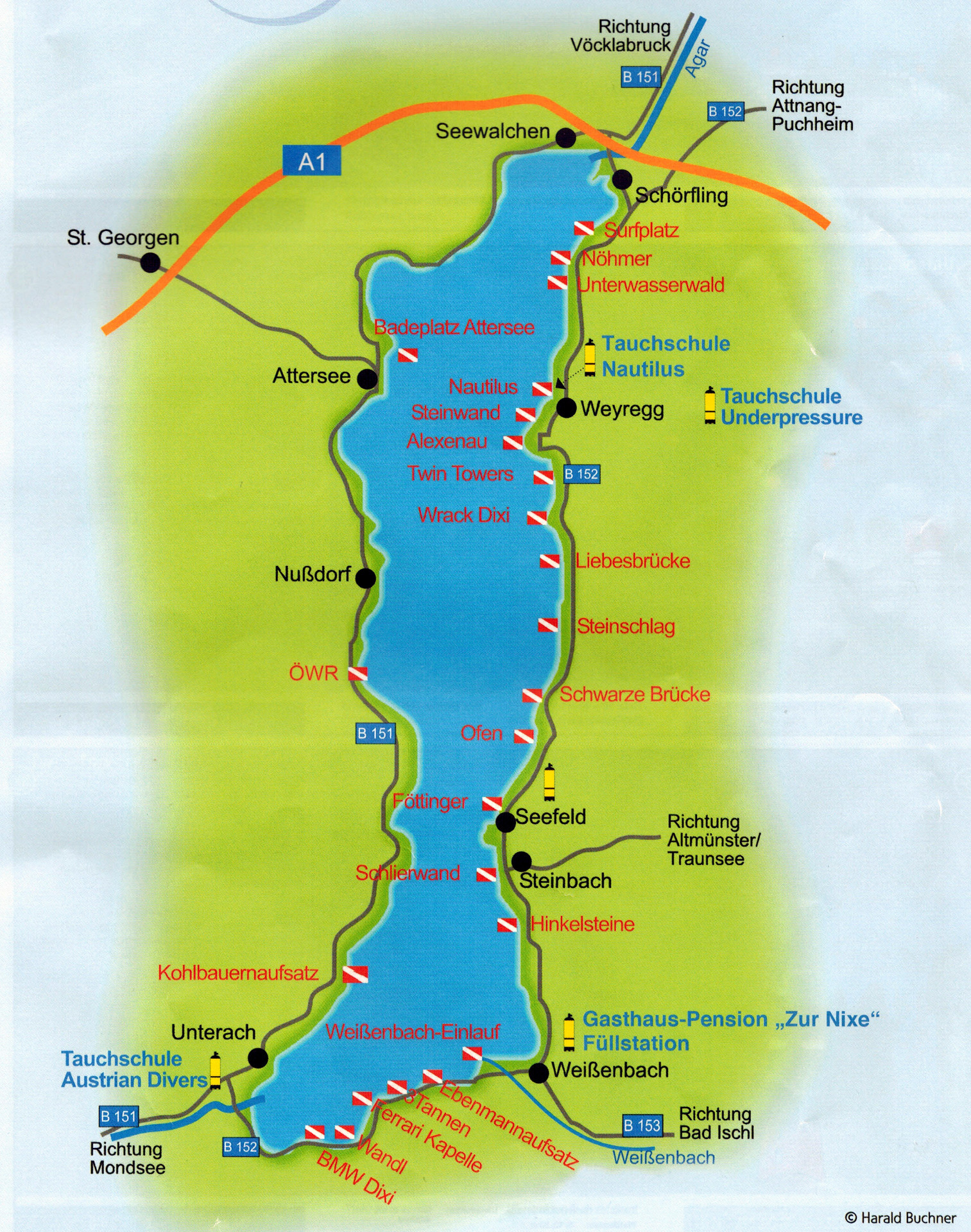 Oczywiście we wszystkich jeziorach położonych w tym rejonie jest możliwość nurkowania i w każdym znajdzie się coś ciekawego do obejrzenia, ale do tego będziemy musieli już opłacić kartę nurkową obowiązującą na wszystkie inne jeziora w okolicy oprócz Attersee takie jak Vordere Langbathsee, Hallstattersee, Vordere Gosausee, Grundlsee, Wolfgangsee, Mondsee. Koszt karty nurkowej to 15 euro. Pieniądze te są przekazywane na tworzenie infrastruktury nurkowej na tym rejonie, która naprawdę jest imponująca.
